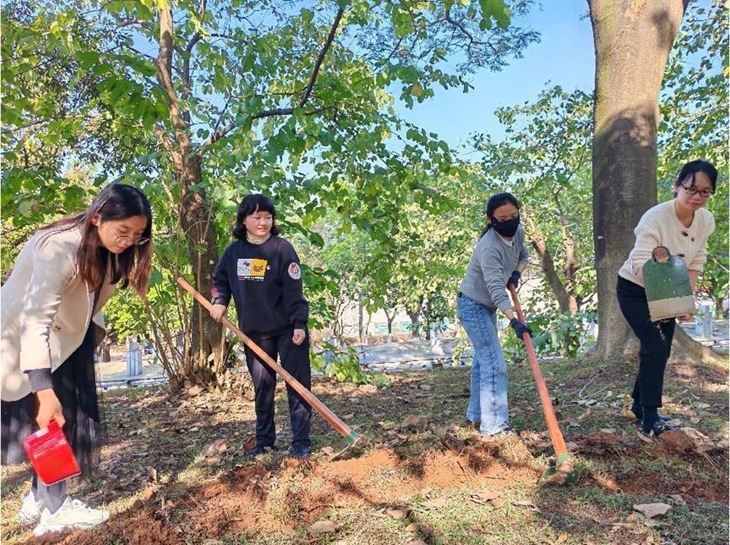 本次活动为求真园内的荔枝林护林工作,主要是挖穴、撒肥、覆土、浇水等。活动开始前,工作人员讲解了求真园内荔枝林种植情况,并普及护林工作要点。在简要学习后,各支部认领工具,分组投入到荔枝林护林工作中。