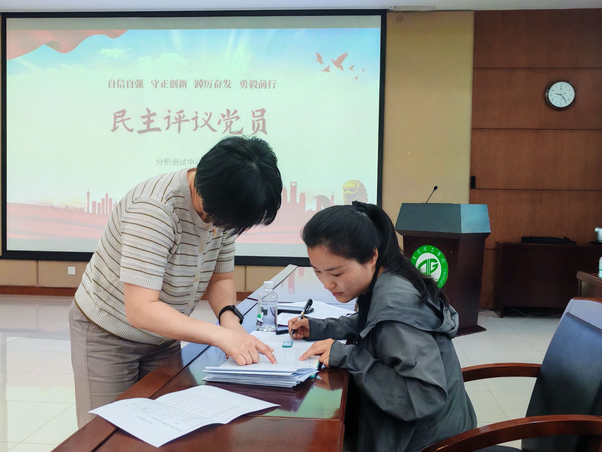 2024年4月18日上午9点,分析测试中心党支部在会议中心301会议室召开党员大会,学习第一议题,开展2023年度民主评议党员。会议由支部书记张敏同志主持,全体党员参加。