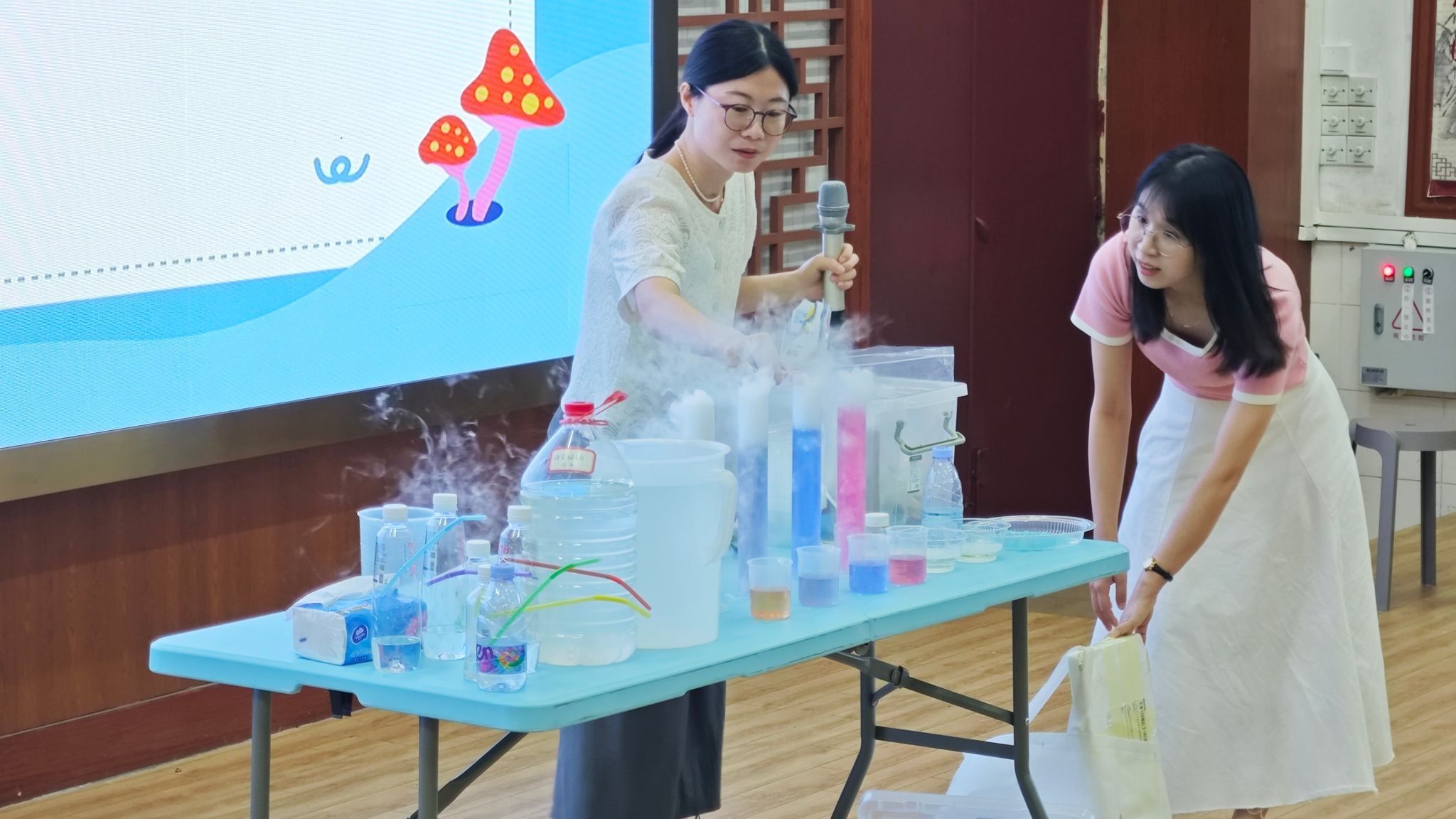 活动现场,来自yl88858永利集团分析测试中心程文雪教师化身科普魔法师,通过干冰制造腾云驾雾的舞台效果,配合化学龙珠变色实验,将酸碱反应、物质状态变化等抽象原理转化为视觉奇观。学生们在烟雾泡泡”“彩虹试管等互动环节中争先恐后举手参与,惊呼声与掌声此起彼伏。
